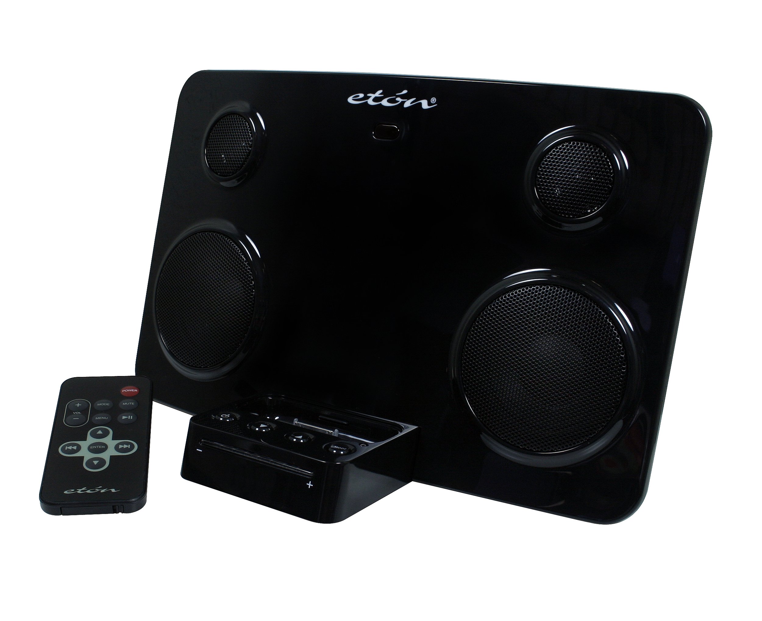Beeld: Voorkant view of the Eton Sound 50 Speaker System with an iPod docked, showcasing its speakers and controls.