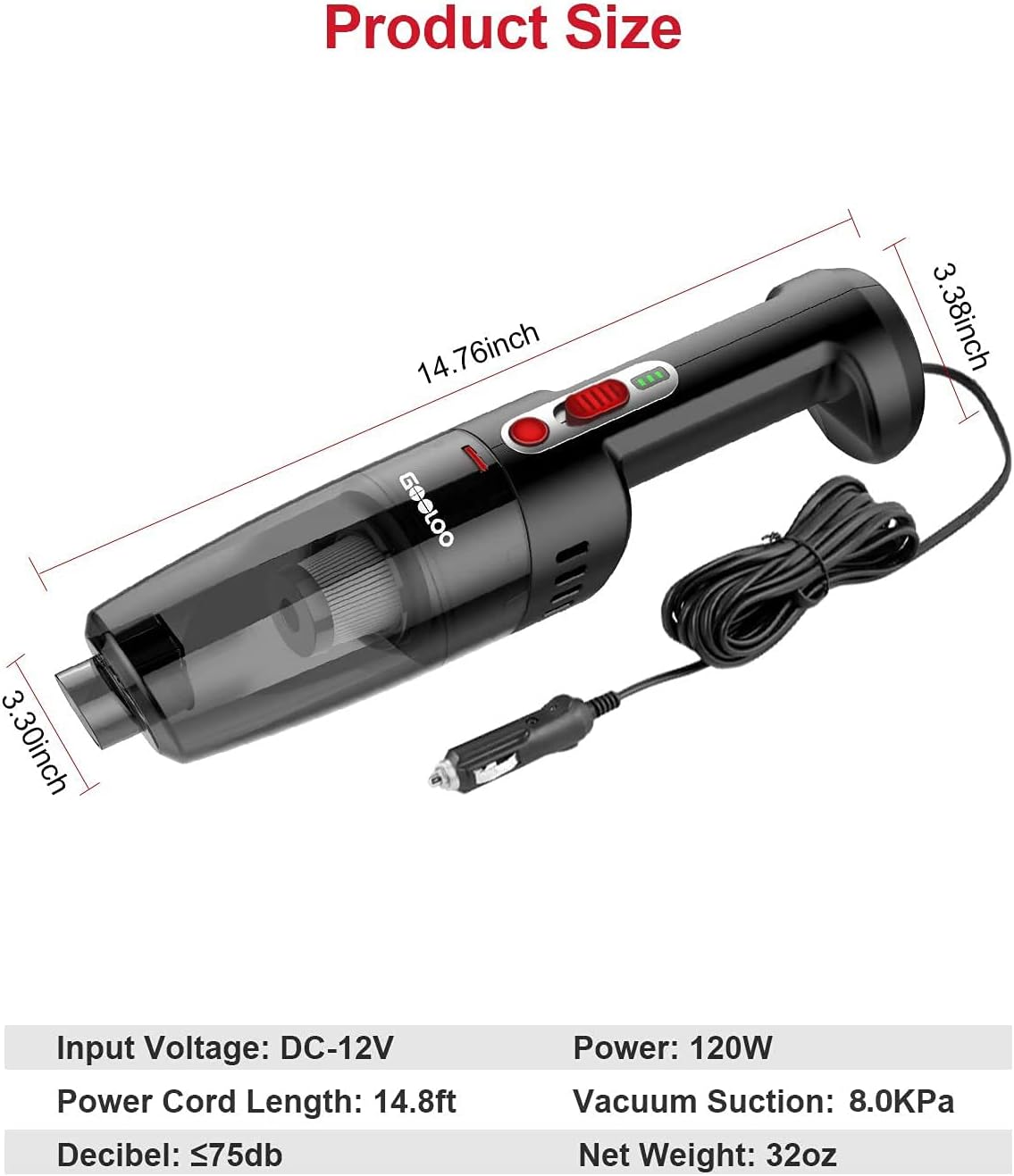 Beeld: Oorview of the GOOLOO Car Vacuum Cleaner showcasing its compact size, strong suction, HEPA filter, and long power cord.