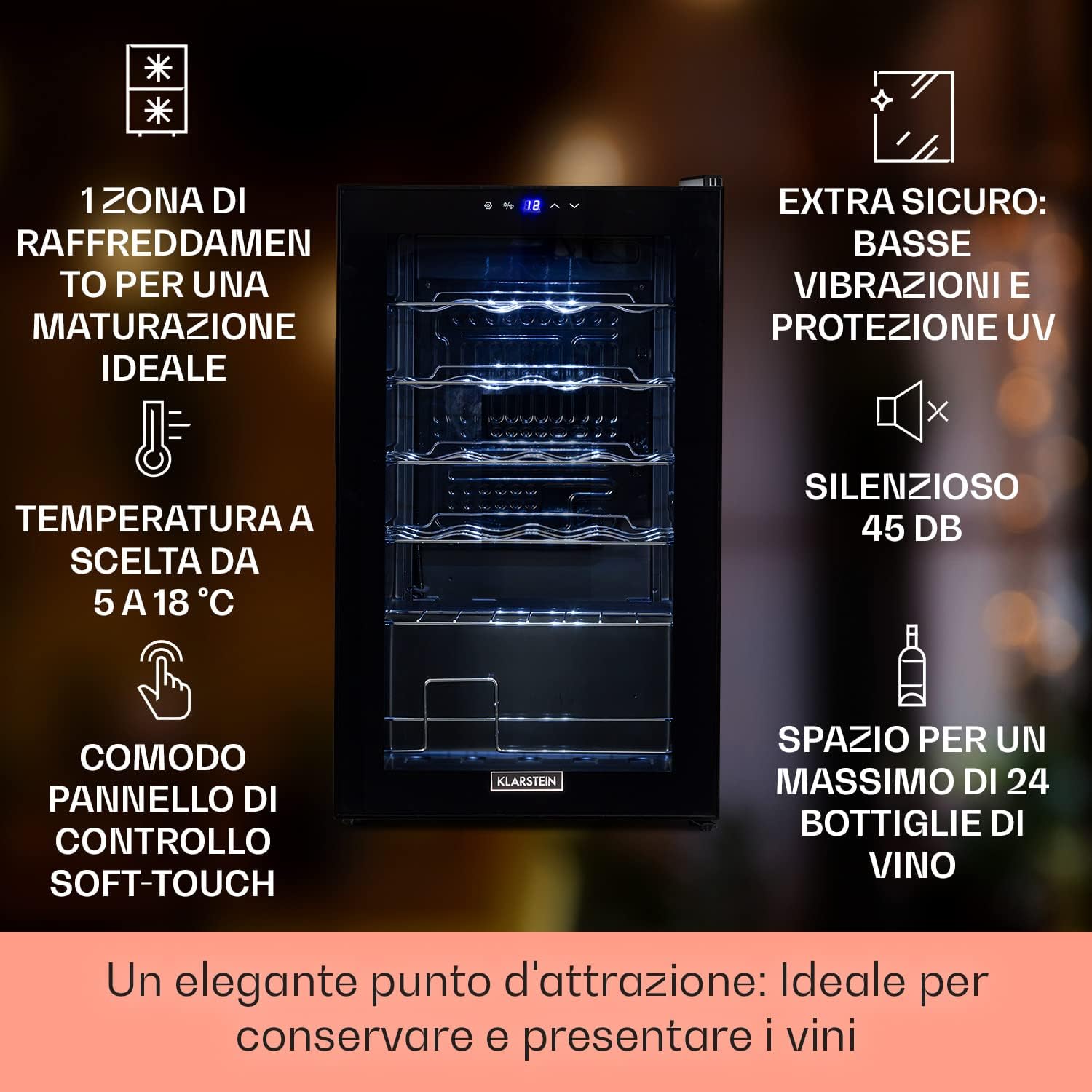 Beeld 3.1: Voorkant view of the KLARSTEIN Shiraz Uno wine cooler, highlighting its single cooling zone, 5-18°C temperature range, soft-touch control panel, low vibration, UV protection, 45 dB silent operation, and capacity for 24 wine bottles.