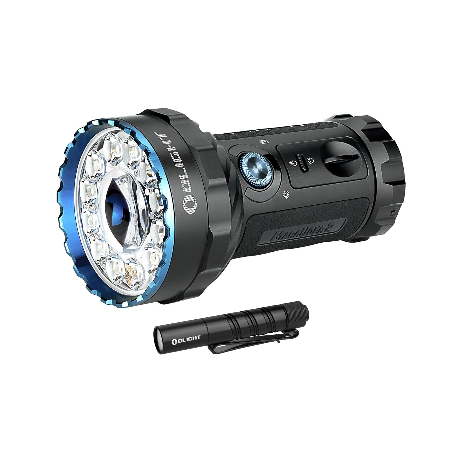 Image: The OLIGHT Marauder 2 flashlight, showcasing its robust design with a large central LED for spotlight and multiple surrounding LEDs for floodlight, along with control switches.