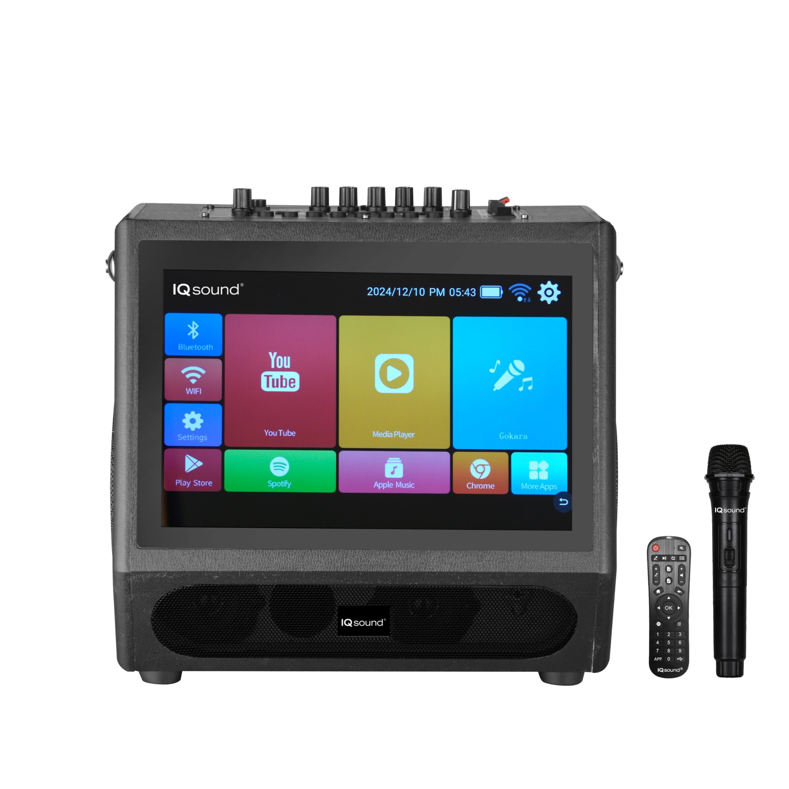 The IQ Sound IQ-1505WK is a feature-rich portable karaoke system designed for high-quality audio and interactive entertainment. It integrates a 12.1-inch capacitive touch screen, dual 5-inch woofers, and 2-inch tweeters for clear sound, powered by a 5000W peak output. Running on Android 12.1 with a quad-core processor, it offers Wi-Fi, Bluetooth, HDMI, USB, and Micro SD connectivity. A built-in 5400mAh rechargeable battery provides portability.