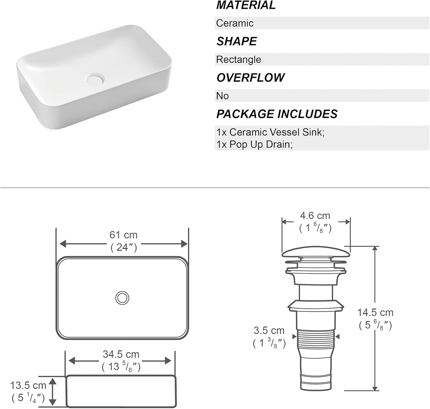 Image: Package contents and basic specifications. This image illustrates the ceramic vessel sink and the included pop-up drain, detailing its material (ceramic), shape (rectangle), and confirming no overflow feature.
